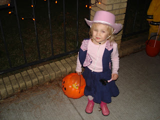 Here are a few shots from Cayton's trick or treat fun. She was quite a candy gathering pro. I wasn't sure if she would understand the procedure, but she had it totally under control. She would head right up to the front door of any house and say "trick or treat!" Then, she would hold up her pumpkin and wait for the goodies. Of course, since she's militantly polite, she would yell "Thank you!" as loudly as possible. Then, she would wait for a "You're welcome". If she didn't hear it, she would repeat "Thank you" until she did. For the record, "You bet" is not an appropriate response to "Thank you" as far as my baby girl is concerned. Either you pony up with a "You're welcome", or you're going to answer to this 3 foot tall etiquette nazi.